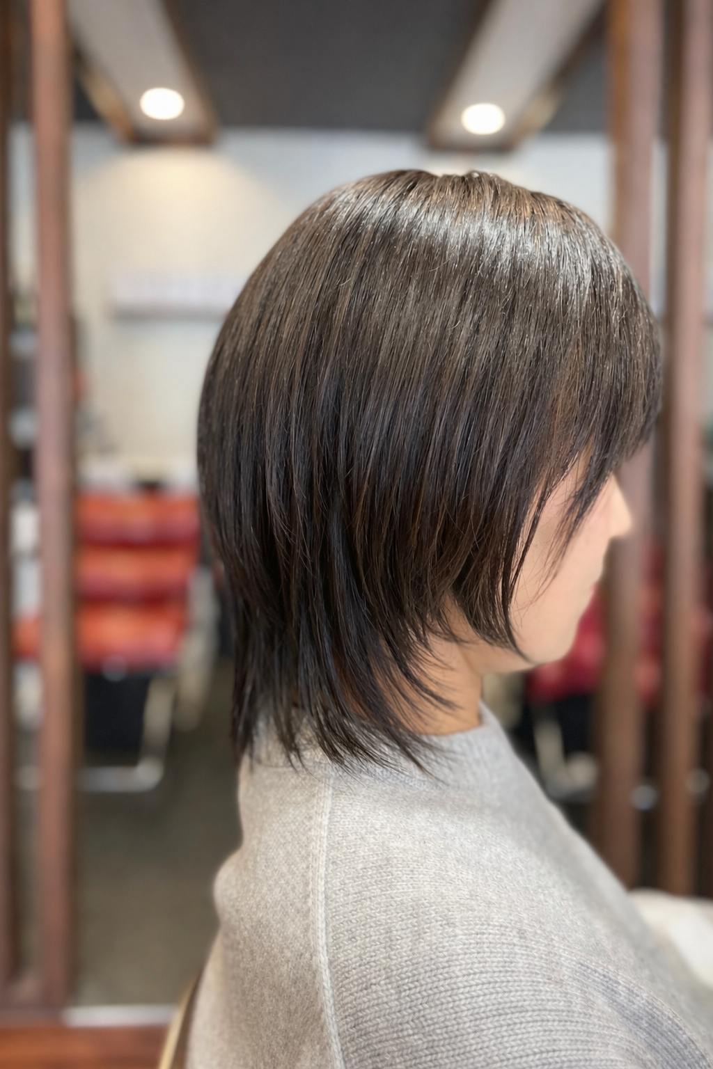 カラーは暗めのブラウンベース。派手さはないけれど、光に当たると柔らかく見える質感カラーに仕上げています。職場でも浮かない、でも確実に「雰囲気が変わった」と感じてもらえる絶妙なトーン設計。30代〜40代のお客様から特に支持をいただいています。